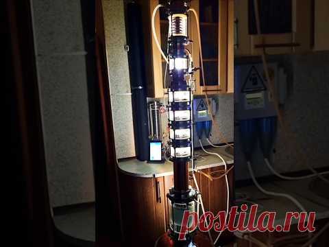 На фотографии изображен самогонный аппарат, установленный на кухне. Аппарат представляет собой высокую колонну с несколькими стеклянными секциями, каждая из которых освещена отдельной лампой. Колонна выполнена из металла темного цвета, что придает устройству современный и технический вид. Вокруг колонны видны различные шланги и кабели, подключенные к аппаратуре для управления процессом дистилляции. На заднем плане видна кухня с деревянными элементами мебели и плиткой на стене светлых тонов, создающей контраст с темным оборудованием. Стены украшены элементами из дерева, дополняющими общий интерьер кухни. Вся атмосфера вокруг самогонного аппарата намекает на технологичность и продуманность процесса, подчеркивая внимание к деталям и аккуратность хозяина помещения.