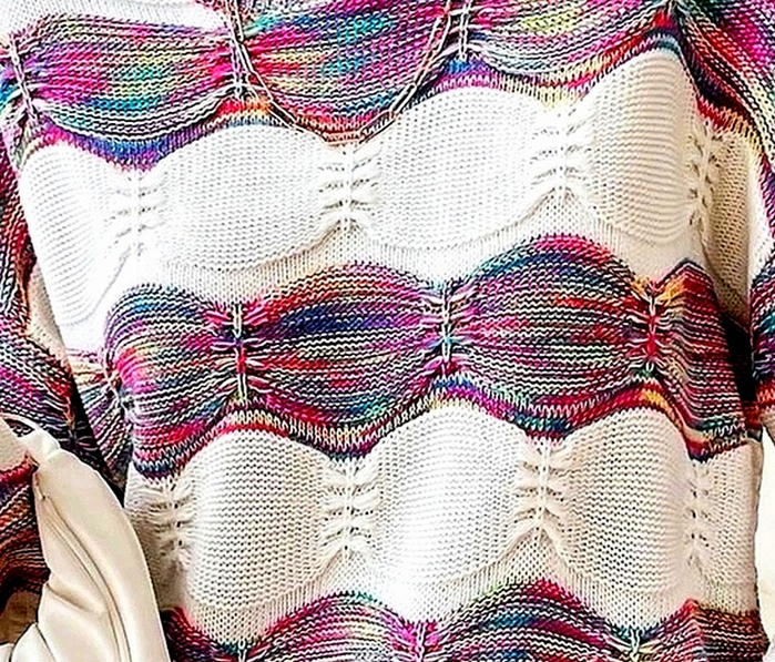 На изображении представлен фрагмент вязаного свитера с ярким и необычным узором. Свитер выполнен в белом цвете, с волнообразными полосами, которые чередуются с многоцветными участками. Эти участки содержат насыщенные оттенки розового, синего, фиолетового и зеленого, создающие абстрактный рисунок, напоминающий калейдоскоп. Общая текстура ткани плотная и выглядит объемно, что подчеркивается узором. Каждая полоска тщательно связана, формируя уникальный геометрический мотив. На изображении также видна часть светлой сумки, расположенной в левой части кадра. Такое сочетание элементов создаёт современный и креативный образ, привлекая внимание своим оригинальным дизайном. Фон нейтральный, что позволяет свитеру стать центральным элементом композиции и полностью раскрыть свою уникальность и яркость. Это изображение прекрасно иллюстрирует креативный подход в использовании цвета и текстуры в современной моде.