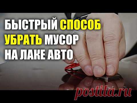 На изображении видна рука, тщательно держащая небольшой предмет над поверхностью, которая, вероятно, является автомобильным лаком. Фон слегка размытый, что делает акцент на главном объекте. Большие и яркие шрифты надписи "БЫСТРЫЙ СПОСОБ УБРАТЬ МУСОР НА ЛАКЕ АВТО" занимают значительную часть верхней половины изображения, использованы белые и жёлтые буквы для выделения ключевых слов. В нижнем правом углу находится логотип "postila.ru". Атмосфера изображения указывает на практическое руководство или совет по уходу за автомобилем. Лак автомобиля светится отражением окружающего света, усиливая визуальную привлекательность композиции.