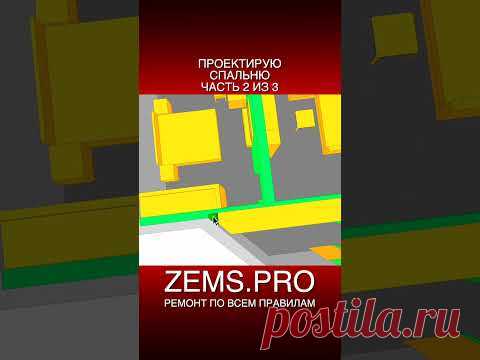 Изображение является рекламным баннером проекта ZEMS.PRO. На верхней части изображения находится текст: "Проектирую спальню, часть 2 из 3", выполненный белыми буквами на тёмно-красном фоне. Центральная часть баннера представляет собой абстрактное изображение с элементами трёхмерной графики, включающими яркие жёлтые блоки и зелёные линии, создающие иллюзию городской структуры. Низ баннера содержит название "ZEMS.PRO", а также фразу "Ремонт по всем правилам", подчёркивающую профессиональный подход. Всё это размещено на тёмно-красном фоне, создавая впечатление строгости и надёжности. Внизу, справа, присутствует логотип или водяной знак с надписью "postila.ru", указанный светлым шрифтом на тёмной площади. Общая композиция передаёт чувство организованности и модернизма, а игра контрастных цветов подчёркивает профессионализм и внимание к деталям.