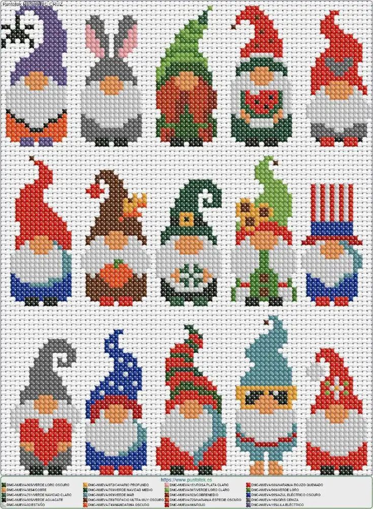 На изображении представлена коллекция веселых гномов, вышитых крестиком. Каждый гном уникален и обладает своей цветовой схемой и характерными деталями. Гномы декорированы в различных шляпах: с ушками кролика, с американским флагом, в зеленом и красном оформлении. Некоторые из них держат аксесуары, такие как арбуз или цветы, придавая композиции игривый и праздничный вид. Фон белый, что подчеркивает яркость и контрастность персонажей, выделяя их забавный стиль. Все работы тщательно проработаны крестиком различными яркими цветами, создавая ощущение оптимизма и сказочности. В нижней части изображения находятся ссылки и обозначены используемые цвета ниток.