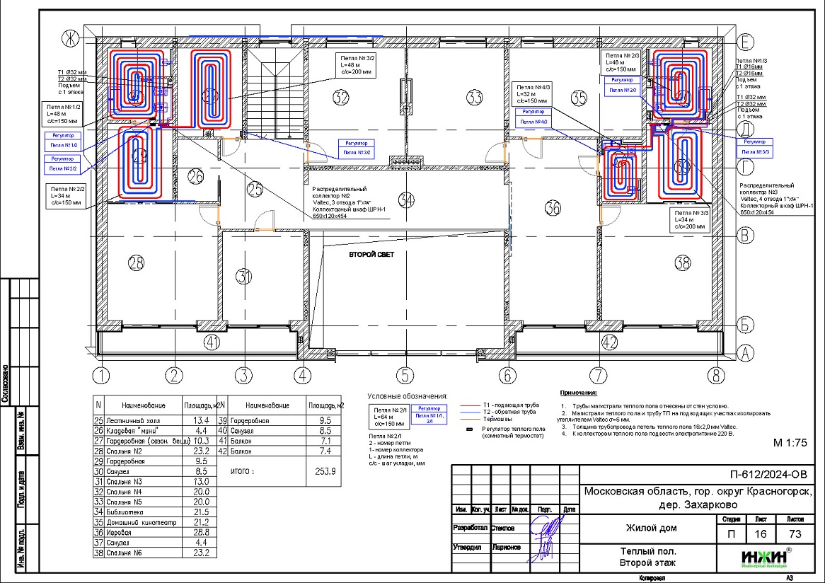 Изображение представляет собой детальный архитектурный план, выполненный на бумаге формата A1. На нём изображена конструкция второго этажа здания, расположенного в Московской области, в городском округе Красногорск. Чёткие линии и указания размеров подчёркивают точность чертежа. На плане отмечены различные элементы, такие как лестницы и комнаты, в том числе с указанием площадей. План насыщен техническими обозначениями и условными знаками для элементов инженерных коммуникаций, таких как отопление и вентиляция, указанные цветами: синим и красным. В нижней части присутствует таблица с данными о наименованиях помещений и их площадях. Дизайн плана подчёркивает использование стандартных обозначений, что делает его понятным для специалистов. Также видно название проекта, указание компании разработчика и дату плана.