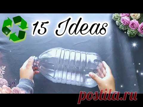 Изображение представляет руки, держащие большую прозрачную пластиковую бутылку, расположенную горизонтально на темной поверхности. Справа виден пышный букет розовых и белых искусственных цветов, добавляющий яркость и контраст. В левом верхнем углу изображен зеленый символ переработки, рядом с ним текст "15 Ideas". Слоган на английском языке привлекает внимание к возможным креативным проектам или идеям переработки. Видео с подобным оформлением может предлагать советы по вторичному использованию предметов или DIY-идеи. На переднем плане видны женские руки в сером свитере, который контрастирует с темным фоном. Общая атмосфера изображения создаёт ощущение творческой активности и вдохновения.