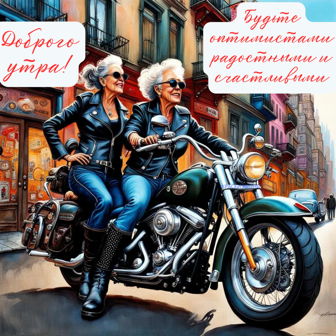 В этом ярком изображении две пожилые женщины, одетые в стильные кожаные куртки, с блестящими металлизированными элементами, сидят на мощном мотоцикле Harley-Davidson. Они улыбаются и выглядят бодрыми, их седые волосы красиво контрастируют с темными очками. Мотоцикл блестит в солнечных лучах на фоне улицы, заставленной старыми многоэтажными зданиями с архитектурой, напоминающей ретро стиль. На заднем плане виднеются балконы и яркие вывески магазинов, создающие атмосферу крупного города. Теплые, приглушенные цвета изображения подчеркивают атмосферу свободы и приключений. Надпись "Доброго утра!" и "Будьте оптимистами, радостными и счастливыми" добавляют позитивного настроения к сцене. В правом нижнем углу просматривается логотип postila.ru, указывающий на ресурс посткарт, к которому относится это изображение.
