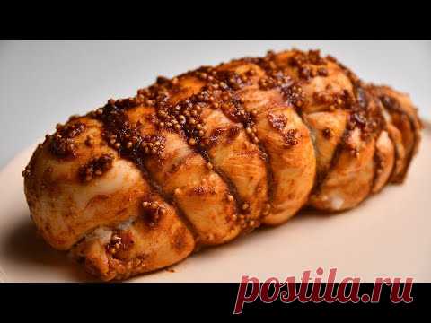 На изображении представлено аппетитное блюдо — рулет из курицы, обильно покрытый специями и горчичными зернами. Золотисто-коричневая корочка рулета указывает на правильное приготовление и ароматную начинку. Видны аккуратные разрезы, которые подчеркивают начинки. Блюдо лежит на светлом керамическом блюде нейтрального цвета, чтобы акцентировать внимание именно на пище. Освещение фотографии демонстрирует блеск масла и соусов на поверхности рулета, добавляя глянцевый вид. Задний план едва различим, без отвлекающих деталей, что позволяет сосредоточиться исключительно на изысканном блюде перед вами. Ощущение тепла и уютности создается благодаря теплой цветовой гамме и текстуре блюда, пробуждая аппетит.