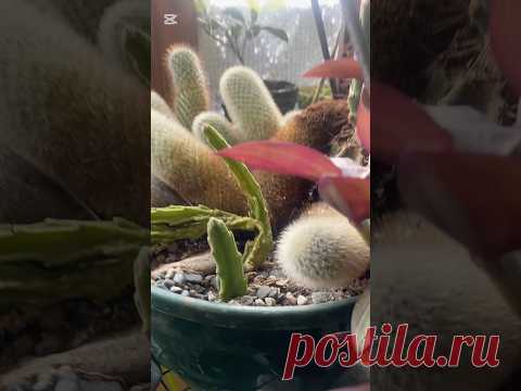 На изображении в центре композиции можно увидеть горшок с различными кактусами. Кактусы имеют разнообразные формы и цвета: от длинных и вытянутых с мягкими белыми щетинками до небольших, округлых и покрытых густыми колючками. Горшок находится на фоне светлого окна, через которое прорываются лучи дневного света, создавая тёплую и уютную атмосферу. Вокруг горшка видно несколько растений с насыщенно красными листьями, которые добавляют контраст зелёным кактусам. Растения посажены в темно-зелёный горшок, наполненный мелкими камешками, которые обеспечивают дренаж. Вдалеке виднеются другие цветочные горшки и зелень, что может свидетельствовать о нахождении на балконе или в зимнем саду.