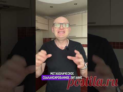 На изображении мужчина в очках, одетый в черную футболку, находится на кухне. Он стоит перед белыми шкафчиками с небольшой вставкой из красной плитки. Светлая атмосфера помещения подчеркивает его фигуру. Мужчина выглядит уверенно и активно жестикулирует руками. На переднем плане внизу видна надпись "МЕТОБОЛИЧЕСКОЕ СБАЛАНСИРОВАННОЕ ПИТАНИЕ". Фон помещения нейтральный, без лишних деталей, что концентрирует внимание на личности в центре.