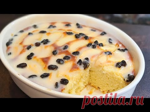 На изображении представлено кулинарное изделие, которое, судя по внешнему виду, является запеканкой или десертом. Оно находится в овальной керамической форме белого цвета. Блюдо покрыто слоем крема или глазури белого цвета, на котором хаотично разложены темные ягоды или изюм, придающие контраст яркой поверхности. В запеканке виден вырезанный кусок, показывающий внутреннюю текстуру, которая выглядит воздушной и нежной, с легким золотистым оттенком. Фон нечеткий и темный, сосредотачивая внимание на самом блюде. Атмосфера изображения уютная и аппетитная, что вызывает желание попробовать это лакомство.
