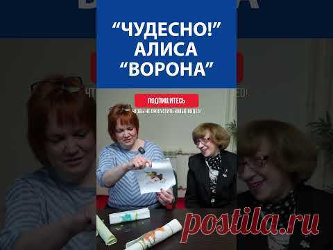 На изображении две женщины сидят за столом и рассматривают лист бумаги с изображением. Женщина слева одета в бледно-голубую кофту, имеет рыжие волосы и очки на голове. Она держит лист с картинкой, демонстрируя его женщине справа. Справа сидит женщина в черной одежде с белым рисунком, вероятно, в очках, и улыбается. Стол перед ними покрыт темным покрытием, на котором лежат свёрнутые в рулоны листы бумаги. В верхней части изображения находится яркое объявление с текстом "ЧУДЕСНО! АЛИСА "ВОРОНА"", а чуть ниже красный баннер с текстом "ПОДПИШИТЕСЬ". Обстановка уютная, с элементами домашнего интерьера на фоне, включая растения.
