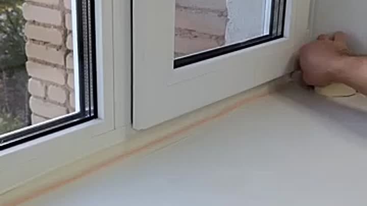 На изображении показан процесс установки или отделки окна. Видно, что кто-то с помощью силиконового герметика или другого материала заполняет щель между оконной рамой и подоконником. Окно выполнено из белого пластика и имеет двойное остекление. Внешняя часть здания частично видна и сделана из кирпича. Ручка, скорее всего, принадлежит мастеру, занятому отделкой. Окно открывает вид на улицу, но сам вид размытый. Атмосфера вокруг спокойная и сосредоточенная.