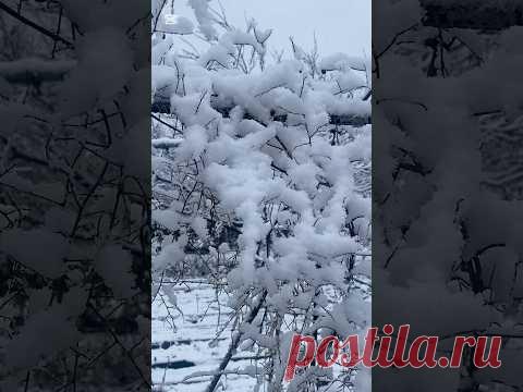 На изображении представлено зимнее пейзажное видение. Ветви деревьев густо покрыты снежным покровом, создавая ощущение мягкости и тишины. Белоснежные хлопья снега плотно облепили тонкие, извилистые ветки деревца, подчеркивая контраст между чёрными ветвями и белым снегом. На заднем плане можно заметить более крупный ствол дерева, также покрытый снегом, что добавляет глубины общему восприятию. Небо затянуто облаками, создавая рассеянное освещение, характерное для зимнего дня, что усиливает атмосферу спокойствия. Изображение передает холодное и ясное утро, напоминая о тихой красоте зимы. Вся сцена выполнена в спокойных, нейтральных тонах серого и белого, придавая снимку медитативное настроение.