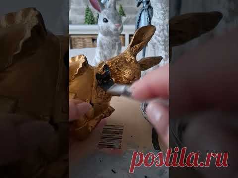 На изображении крупным планом показан процесс создания декоративного изделия в виде зайца, покрытого золотистой краской. На переднем плане видна рука, держащая кисть, которой наносят черную краску на поверхность статуэтки. Это создает эффект глубины и деталей на поверхности зайца. За статуэткой можно увидеть размытого в фокусе другого белого зайца, вероятно, сделанного из меха или ткани, с розовыми ушками, что добавляет контрастности сцене. Фон содержит несколько размытых деталей, таких как плетеная корзина и зелёное растение. Общая атмосфера фотографии спокойная, творческая, с упором на ручной труд и художественное самовыражение. Освещение мягкое, возможно, естественное, что подчеркивает детали всех объектов изображения.