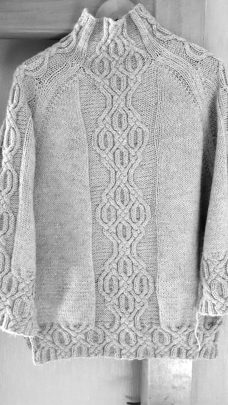 На изображении представлено изделие вяженого искусства в виде свитера, выполненного из мягкой пряжи светло-серого оттенка. Свитер имеет высокий воротник и декорирован изящным узором в виде переплетающихся косичек, придающих ему объемность и сложность. Центральная часть свитера выделяется более крупными узорами, привлекающими внимание и создающими вертикальные линии, которые визуально стройнят изделие. Рукава также украшены аналогичными узорами, поддерживая общий стиль и гармонию. Текстура материала напоминает шерсть или акрил, что предполагает мягкость на ощупь и уют при носке. Светло-серый цвет придает свитеру универсальность и позволяет легко сочетать его с различными предметами гардероба. В целом, изделия такого рода ассоциируются с комфортом и теплом, идеально подходя для холодного времени года. На заднем плане виден деревянный элемент мебели, вероятно, дверь или шкаф, что создает домашнюю и уютную атмосферу интерьера. В правом нижнем углу присутствует водяной знак с надписью "postila.ru".