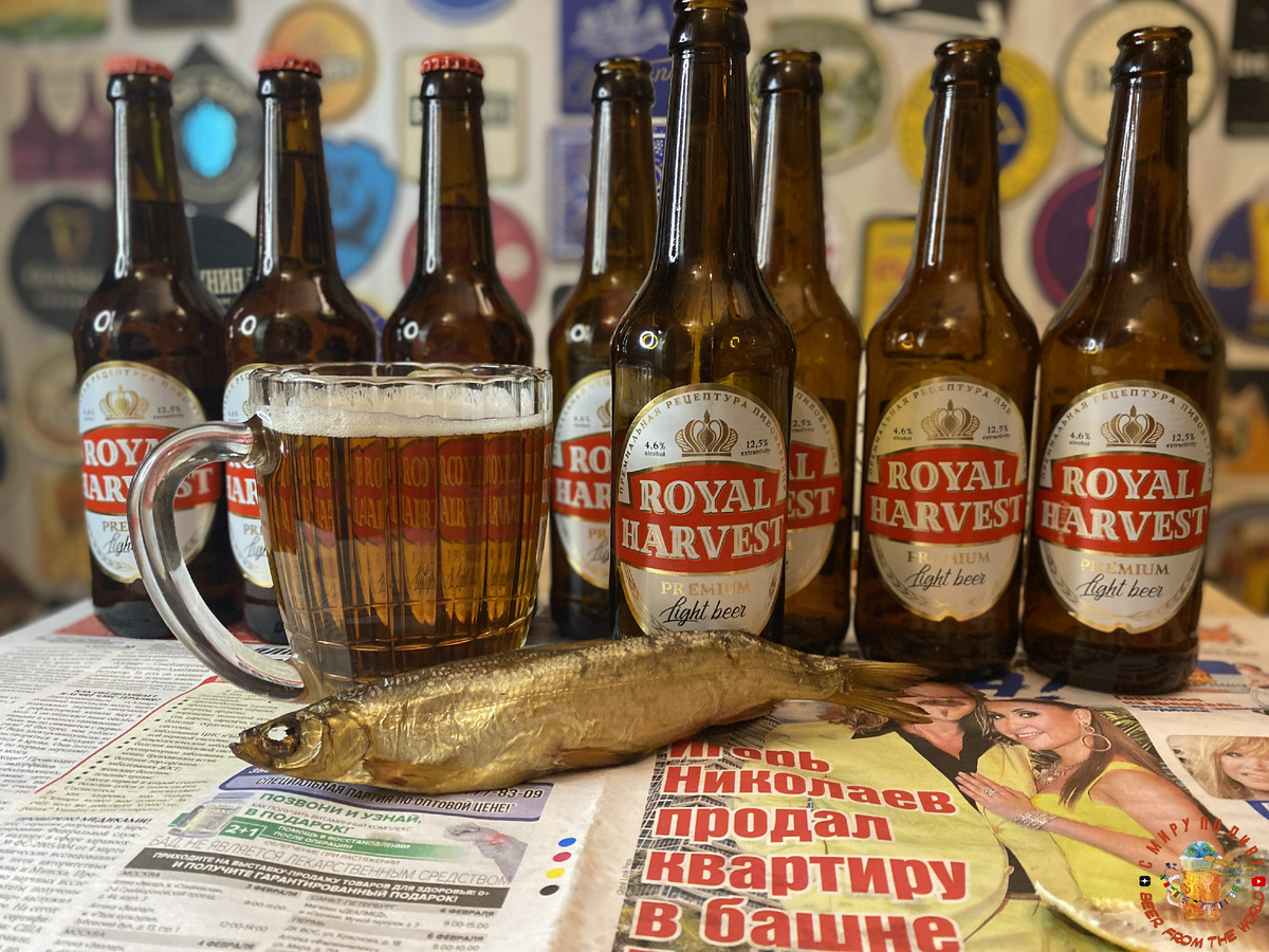 На фотографии изображены восемь бутылок светлого пива марки Royal Harvest с коричневыми этикетками и белыми надписями, расположенные в один ряд. Перед бутылками находится стеклянная кружка, наполненная пенистым пивом, темно-золотистого цвета. На переднем плане лежит копченая рыба, уложенная на газетах, которые служат фоновой поверхностью и демонстрируют различные статьи с заголовками и фотографиями. Атмосфера ассоциируется с домашними или дружескими посиделками, включает элементы простоты и непринужденности. Стена за напитками украшена множеством разноцветных круглыми наклейками или постерами, которая добавляет яркости и немного хаотичности композиции.