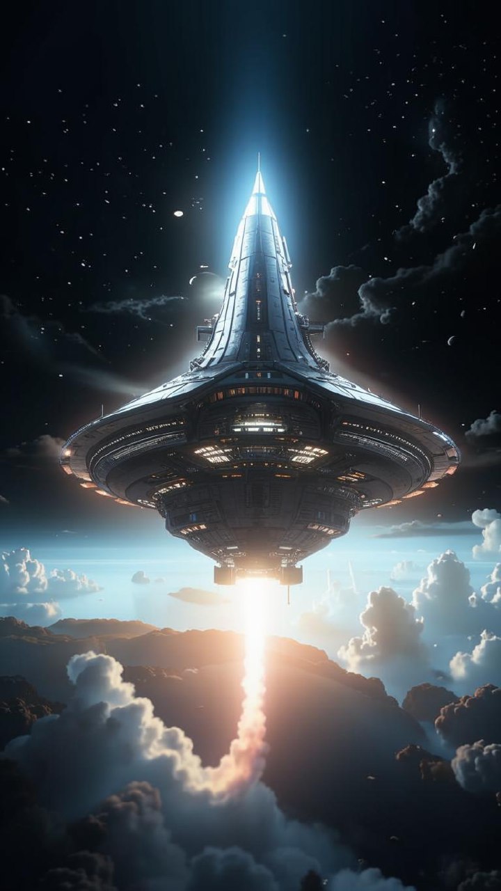 На изображении представлена впечатляющая космическая сцена, где в центре внимания находится огромный космический корабль, устремляющийся в звёздное пространство. Корабль имеет футуристический дизайн с обтекаемыми контурами и светящимися элементами, подчеркивающими его технологическое совершенство. В нижней части виден мощный поток выброса, что указывает на интенсивный запуск. На фоне зрелище фантастических облаков, плавно освещённых солнечным светом, который придаёт сцене загадочное и величественное ощущение. Небо усеяно блестящими звёздами, создавая атмосферу бесконечности и исследования дальних миров. Эта сцена вызывает ассоциации с научной фантастикой, приключениями и неведомыми открытиями, окутанными интригами и потенциальными возможностями.