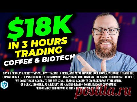 На изображении изображен мужчина с аккуратной бородой и очками, одетый в голубую футболку. Он улыбается и показывает пальцем направо. На фоне рядом с его лицом крупными зелеными и желтыми буквами написано "18K in 3 hours trading coffee & biotech", что подчеркивает финансовую тематику изображения. На фоне можно заметить диаграммы и графики, создающие атмосферу финансового успеха и торговли. Текст внизу говорит о рисках и нетипичности результатов. Снизу справа виден водяной знак сайта.