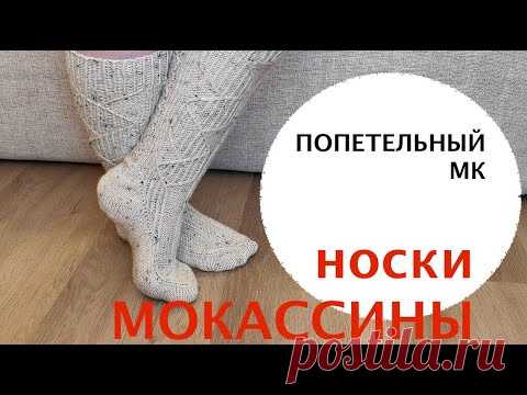 На изображении видны вязаные носки с оригинальным орнаментом. Они выполнены из шерстяной пряжи в светло-серых тонах с заметным узором, который придаёт дополнительный объём и фактуру. Носки длинные, закрывают часть голени, возможно повторяя стиль мокасин. На заднем плане серый диван, что создаёт уютную атмосферу. На переднем плане деревянный пол, добавляющий натуральных оттенков в общую палитру. Надпись в белом круге справа сообщает о мастер-классе по вязанию. Красными буквами написано "НОСКИ МОКАССИНЫ", что указывает на тематику урока. Фотография сделана с акцентом на детали изделия, что подчеркивает его ручную работу и мастерство изготовления. Фон и элементы композиции подобраны так, чтобы выделить главную вещь без отвлекающих деталей.