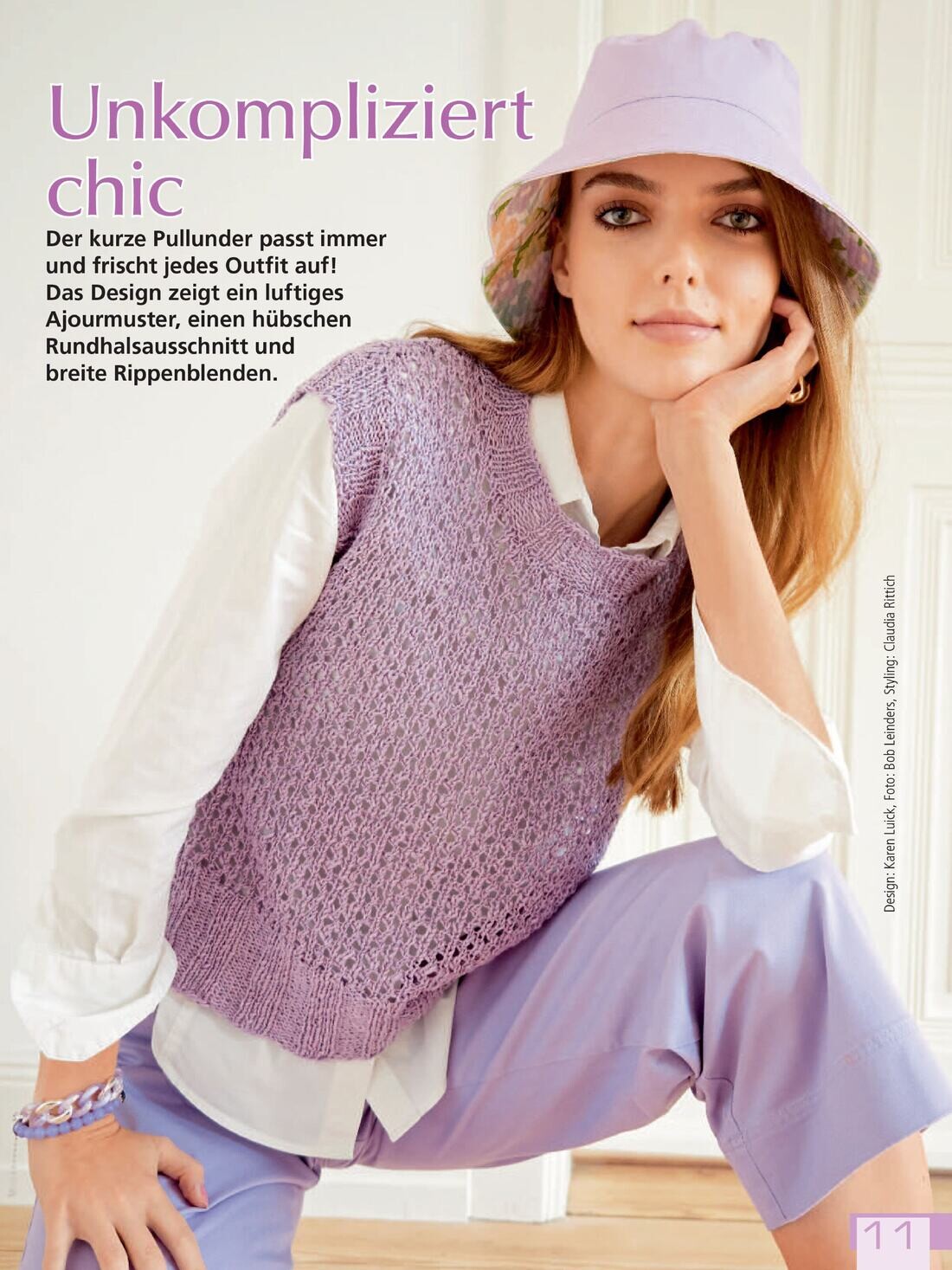 На изображении представлена молодая женщина, сидящая в расслабленной позе. Она одета в фиолетовый вязаный пуловер с ажурным узором поверх белой рубашки. Штаны у нее также фиолетового цвета. На голове у нее фиолетовая панама, что придает образу легкость и стиль. Цветовая гамма одежды гармонично сочетается, создавая общее нежное и свежее впечатление. Девушка смотрит прямо в камеру, слегка опираясь на левую руку, лицо расслаблено и выражает спокойствие и уверенность. Фон светлый, что подчеркивает стиль одежды и создает атмосферу непринужденного шика. Крупные черты и внимание к деталям в образе делают его запоминающимся.