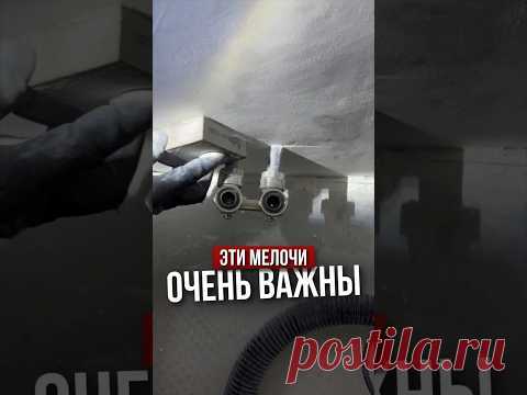 На изображении отображена рабочая сцена, где две руки в темных перчатках держат строительный инструмент, прикладывая его к потолочной поверхности. Под инструментом видны трубы, предполагающие установку какого-либо устройства. На картинке также есть текстовые элементы: "Эти мелочи ОЧЕНЬ ВАЖНЫ", что подчеркивает значимость точности в работе. Фон фотографии серый и выглядит промозглым. Внизу и по бокам видны частицы остаточного шума или обои.