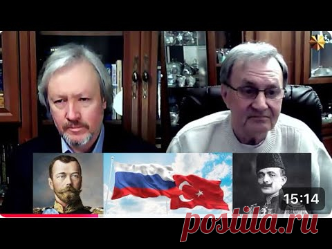 На изображении два мужчины, сидящие перед камерой. У обоих седые волосы; один с бородой и в пиджаке, другой в очках и светлом свитере. Позади них книжный шкаф с посудой. На переднем плане размещены портреты Николая II и османского лидера, а также флаги России и Турции. Атмосфера кадра напоминает об историческом контексте или дискуссии, связанной с этими странами. Видео продолжается 15 минут 14 секунд.