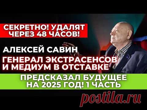 На изображении находится пожилой мужчина в темном костюме и клетчатой рубашке, которого звали Алексей Савин. Рядом с мужчиной находятся яркие надписи, которые привлекают внимание. Верхняя часть изображения заполнена красной полосой с крупным текстом: "СЕКРЕТНО! УДАЛЯТ ЧЕРЕЗ 48 ЧАСОВ!" Белыми буквами на черном фоне указан статус Алексея как "ГЕНЕРАЛ ЭКСТРАСЕНСОВ И МЕДИУМ В ОТСТАВКЕ". На зеленом фоне в нижней части читается следующее объявление: "ПРЕДСКАЗАЛ БУДУЩЕЕ НА 2025 ГОД! 1 ЧАСТЬ". Фон, на котором записан этот текст, представляет собой комбинацию ярких цветовых блоков — красного и зеленого, создающих атмосферу срочности и важности. Название сайта написано в углу: postila.ru, что указывает на интернет-ресурс, откуда, вероятно, этот контент был получен.