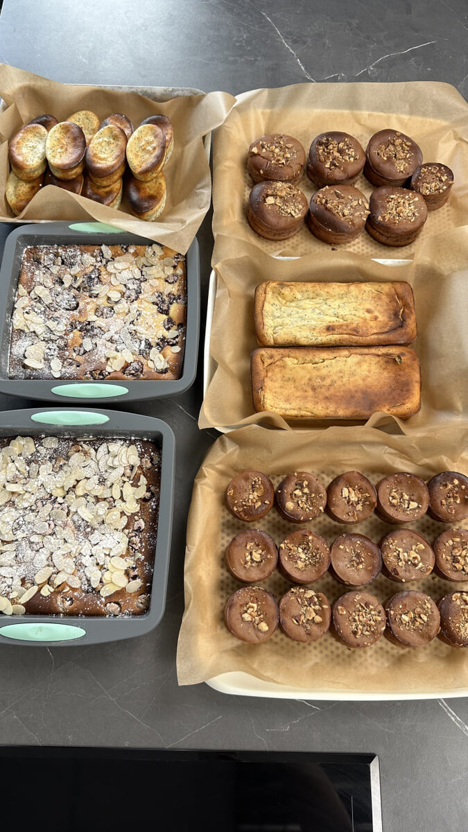 На изображении представлено множество выпечки, расположенной на противнях, покрытых бумагой для выпечки. Слева находятся два квадратных противня с пирогами, украшенными срезанными миндальными листьями и сахарной пудрой. Пироги имеют светло-коричневый цвет и содержат темные пятна, вероятно, ягоды или фрукты. Справа на пергаментной бумаге расположены два прямоугольных хлеба золотисто-коричневого цвета с равномерно пропеченной корочкой. Рядом находится еще одна партия круглых, коричневых кексов с посыпкой из орехов на их верхушке. На отдельной бумаге находятся ряды больших овальных пирогов. Они имеют тёмную, золотистую корочку. Все изделия выглядят аппетитно и сохранили свой свежий и аккуратный внешний вид. Фоновая поверхность стола темная, что подчеркивает яркость выпечки.