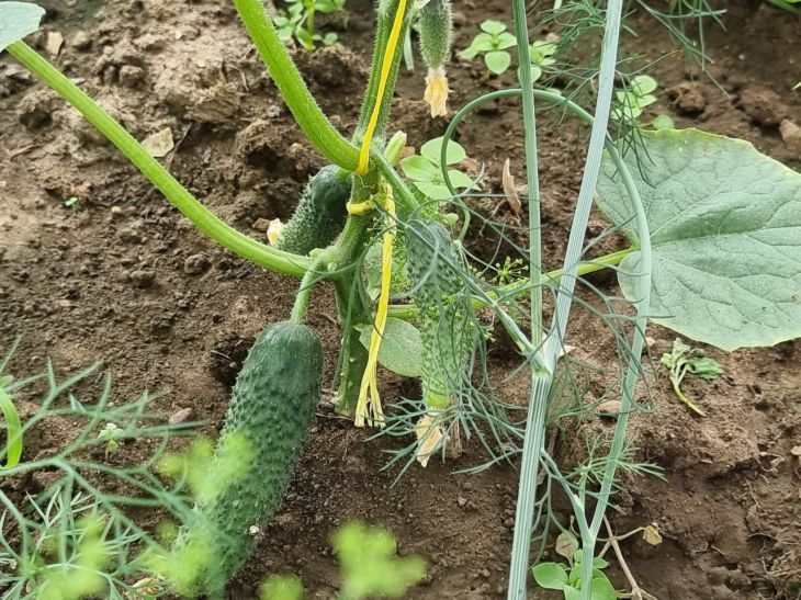 На изображении представлено растение с растущими огурцами на фоне плодородной земли. Огурцы имеют характерную бугристую поверхность и насыщенный зелёный цвет. Видны несколько стеблей, на которых они растут, также на снимке можно заметить листья огурца, сочные и зелёные, с заострённой треугольной формой. На переднем плане можно увидеть несколько других овощей или трав, придающих картине естественную и органическую атмосферу. Растение окружено естественной средой, что говорит о его нахождении в огороде или частном саду. Земля имеет тёмно-коричневый цвет и выглядит влажной, что создаёт впечатление недавно прошедшего дождя или тщательного полива. Нащупываются лёгкие тени, бросаемые растениями, что говорит о дневном времени суток. Фото подаёт ощущение умиротворённости и гармонии с природой.