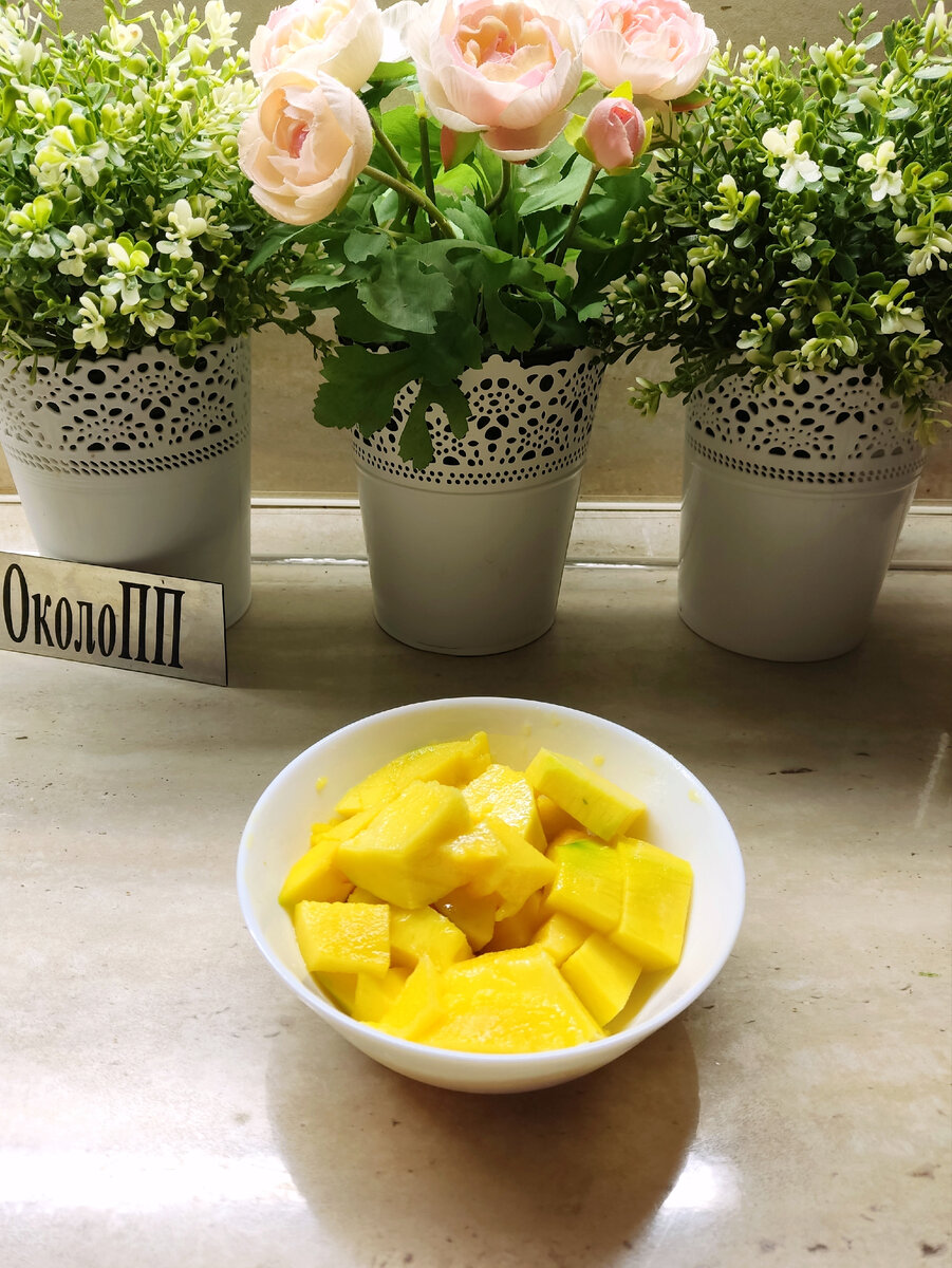 На изображении представлены три белых кружевных горшка с цветами, стоящие на светло-бежевой поверхности. В каждом горшке находятся зелёные растения с пышной листвой и нежными цветами пастельных тонов, среди которых преобладают розовые и кремовые оттенки. Слева от горшков видна небольшая табличка с надписью "ОколоПП". Перед горшками расположена белая миска, наполненная нарезанными кубиками манго ярко-жёлтого цвета. Атмосфера фотографии светлая и свежая, создающая впечатление спокойствия и гармонии благодаря сочетанию природных элементов и спокойных цветовых тонов.