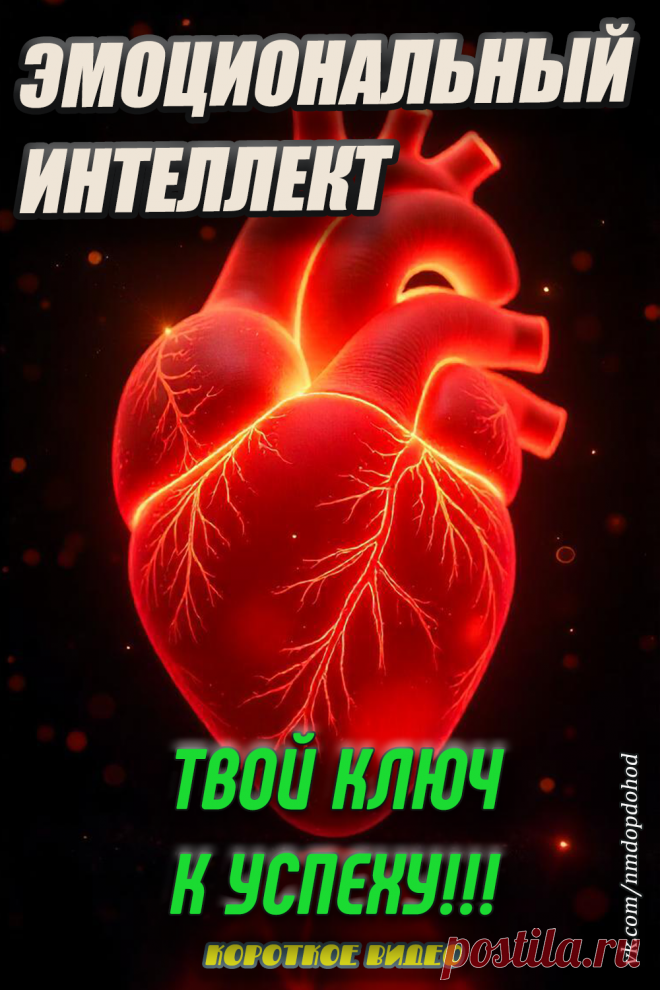 Это изображение содержит яркую визуальную репрезентацию человеческого сердца с возрастающим светом, который подчеркивает вены и артерии. Сердце окрашено в насыщенные красные и оранжевые тона, создающие ощущение тепла и интенсивности. На изображении присутствует текст: "ЭМОЦИОНАЛЬНЫЙ ИНТЕЛЛЕКТ" в верхней части и "ТВОЙ КЛЮЧ К УСПЕХУ!!!" в нижней части, написанный крупными, выразительными шрифтами. Общая атмосфера визуала напоминает о важности эмоционального интеллекта для достижения успеха. Фон слегка затемнен, чтобы подчеркнуть контрасты и яркость сердечной формы. Логотип "postila.ru" находится в правом нижнем углу, добавляя авторское оформление.