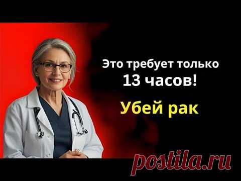 На изображении представлена женщина-врач с седыми волосами, одетая в белый медицинский халат поверх темно-синего платья. У нее на шее висит стетоскоп и на лице очки. Она уверенно смотрит вперед, создавая профессиональное впечатление. Фон изображения выполнен в ярко-красном и черном сочетании, создающем драматическую атмосферу. Справа от врача виден текст на русском языке: "Это требует только 13 часов! Убей рак". Это может быть частью рекламной кампании или социального плаката. В нижней части изображения виден водяной знак "postila.ru".