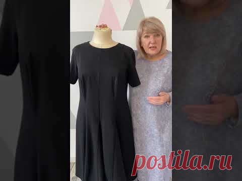 На изображении представлена женщина, стоящая рядом с манекеном, на котором надето черное платье. Платье имеет простой, но элегантный крой с короткими рукавами и круглым вырезом. Сама женщина одета в светло-серое платье с длинными рукавами. На заднем плане видно стену с геометрическим рисунком в виде треугольников нескольких цветов, включая розовый, серый и белый. Атмосфера спокойная и сосредоточенная, явно связанная с демонстрацией или обсуждением одежды. Женщина говорит или объясняет что-то относительно платья, используя жесты руками. На изображении также можно увидеть логотип сайта «postila.ru», что указывает на возможное использование изображения в контексте онлайн-контента, связанного с модой или шитьем.