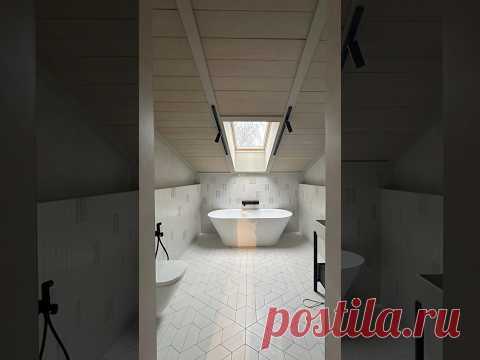 Изображение представляет собой современную ванную комнату с мансардной крышей, создающей уютное пространство. В центре находится большая белая ванна овальной формы с элегантным изливом, расположенная у дальней стены. На стене и полу уложен светлый керамический кафель, улучшающий светопроницаемость. Прямо над ванной установлено окно мансардного типа, пропускающее естественный свет, что делает комнату более светлой и просторной. Боковые стены крыши имеют наклонные поверхности, что добавляет интерьеру динамику и оригинальность. По бокам от ванны можно увидеть элементы темной сантехники, включая современные смесители. Общий тон помещения выдержан в светлых пастельных оттенках, создавая атмосферу свежести и чистоты.
