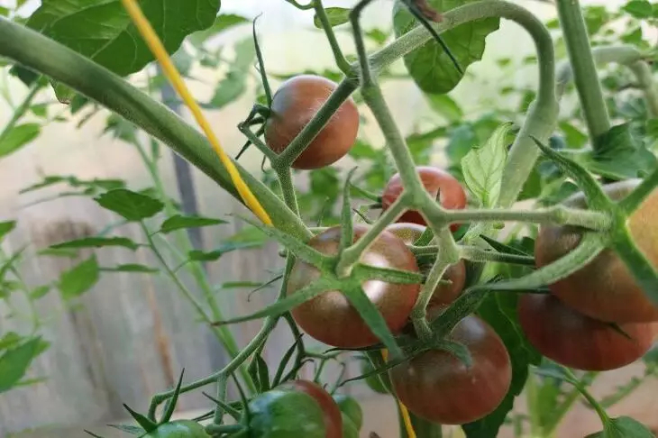 На изображении представлены ветви растения томатов, расположенные в теплице или оранжерее. Плоды имеют тёмно-красный оттенок, свидетельствующий о зрелости и готовности к сбору. Ветви томатов покрыты мелкими ворсинками, что типично для этого вида растений. На фоне видны листья, насыщенного зелёного цвета, гармонирующие с общим видом растений. Присутствие жёлтой верёвки указывает на метод подвязки растений, используемый для поддержания их вертикального роста. Обстановка в теплице создаёт атмосферу уюта и благоприятного микроклимата для выращивания томатов, защищая их от внешних элементов и обеспечивая необходимую температуру и влажность. На заднем плане видно стекло или пластик, типичный для покрытия теплиц, что позволяет пропускать естественный свет, важный для фотосинтеза. Свет мягко освещает растения, подчёркивая мелкие детали текстуры плодов и листьев.
