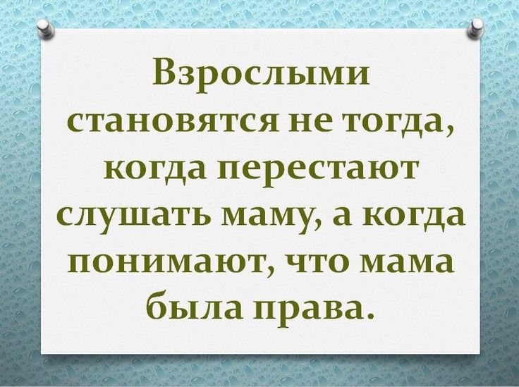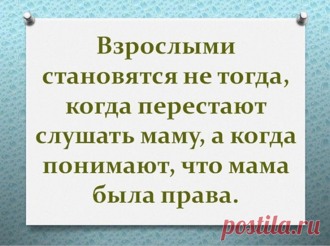 На изображении представлено мотивирующее высказывание на русском языке, выполненное зелёными буквами на белом фоне. Фон состоит из светло-голубого цвета с текстурой, напоминающей перламутр или шелк, создающей иллюзию глубины и нежности. Текст закреплен на доске, углы которой подчеркиваются при помощи виртуальных кнопок, придающих иллюзию физического прикрепления. В левом нижнем углу расположен водяной знак "postila.ru", выполненный в насыщенном красном оттенке. Суть высказывания — размышление о взрослении, связанное с пониманием правоты матерей. Создается впечатление мотивирующей, немного меланхоличной атмосферы, вызывающей глубокие размышления и эмоциональный отклик.