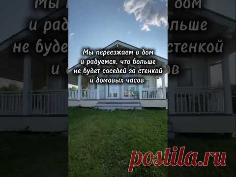 На изображении запечатлён белый дом в сельской местности с хорошо ухоженной зелёной лужайкой перед ним. Дом имеет просторное крыльцо с белыми деревянными перилами. Над крыльцом простирается треугольная крыша, а небо вверху ясное с несколькими облаками. На фотографии поверх изображения размещён текст на русском языке: "Мы переезжаем в дом и радуемся, что больше не будет соседей за стенкой и домовых часов". Это создаёт ощущение спокойствия и новой жизни вдали от городской суеты.