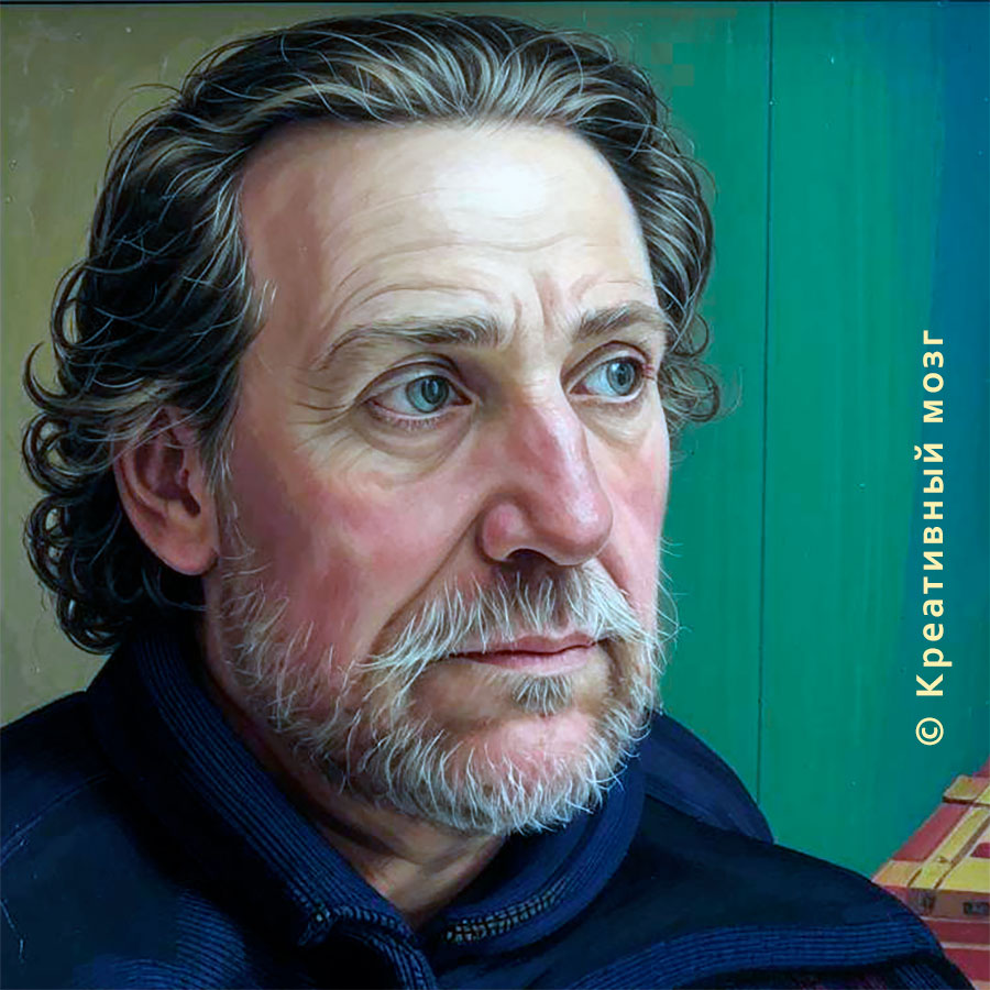 На изображении представлен портрет пожилого мужчины с задумчивым выражением лица. У него густые волнистые волосы тёмного цвета с сединой, которые слегка спадают на лоб и уши. Его лицо характеризуется ярко выраженными чертами и линиями, что подчёркивает присущую ему мудрость и опытность. Мужчина одет в тёмно-синюю куртку, облегающую повседневную одежду. Фон выполнен в приглушённых зелёных и бежевых тонах, что визуально выделяет мужчину на переднем плане. Свет падает на его правую сторону, создавая мягкие тени, добавляя глубину и объём портрету. Этот образ пробуждает у зрителя чувство спокойствия и созерцательности, указывая на внутреннюю гармонию и размышления человека на фотографии.