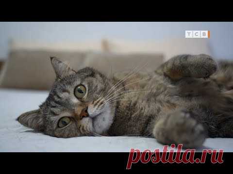 На изображении крупным планом запечатлён серый полосатый кот с яркими зелёными глазами, лежащий на спине на светло-серой поверхности. Его пушистая шерсть с легкими оттенками коричневого и черного привлекает внимание. Кот выглядит расслабленным, уши слегка подняты, а лапы небрежно раскинуты по сторонам. Фон состоит из размытых подушек в светло-бежевых тонах, что создаёт уютную атмосферу в помещении. Видно, что кот доверяет окружающей среде. В правом верхнем углу есть логотип TCB, а в левом нижнем - надпись postila.ru, что может указывать на источник или типа платформы, где была размещена фотография.