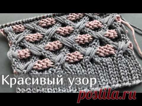 На изображении представлен отрезок трикотажа с замысловатым узором. Преобладающими цветами являются серый и светло-розовый. Узоры выполнены так, что серые петли образуют переплетения, создавая эффектные диагональные линии, в то время как светло-розовые секции заполняют пространство внутри этих диагоналей, создавая аккуратный и гармоничный рисунок. Этот узор выполнен на спицах, о чем свидетельствует видная спица на верхнем краю изделия. На изображении также присутствует текст "Красивый узор", указывающий на уникальность и привлекательность представленного дизайна. В углу виден логотип сайта "postila.ru", что может указывать на источник узора или платформу, где было опубликовано изображение. Это показывает, что изображение связано с рукоделием или модным блогом, где делятся техниками вязания.