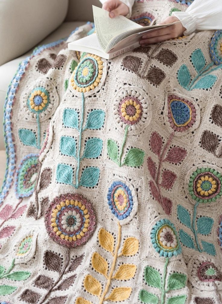 На изображении человек, укрытый вязаным пледом. Плед украшен цветочным орнаментом, выполненным в стиле пэчворк, с элементами различных форм и цветов. В центре каждого элемента видны крупные цветы, выполненные в круглой форме с многослойными лепестками. Основные цвета используемого орнамента — пастельные и нежные оттенки голубого, зеленого, желтого и коричневого. В руках человек держит открытая книга, создавая атмосферу уюта. На переднем плане яркие вязаные мотивы с гладкой и аккуратной вязкой. Плед выполнен в светлой цветовой гамме, что подчеркивает каждую деталь рисунка. Общая атмосфера снимка вызывает ощущение теплоты и покоя, а также уюта домашнего очага и спокойного чтения.
