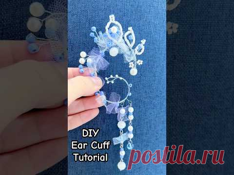 На изображении демонстрируется декоративное украшение для ушей в виде клипсы, выполненной вручную. Работа в основном состоит из бусин и элементов фурнитуры различных форм и размеров. Основной цвет композиции - нежный голубой, что придаёт украшению изящный и воздушный вид. Можно заметить мелкие декоративные элементы, такие как прозрачные и перламутровые детали, создающие ощущение лёгкости. На заднем плане видна светло-синяя ткань, подчёркивающая основной цвет украшений. Рука, аккуратно держащая украшение, указывает на процесс создания, подчёркивая его в рамках "DIY" проекта. Такой тип украшения добавляет уникальности и может стать отличным дополнением к любому современному образу. Это изображение представляет собой кадр из видеоурока по изготовлению подобных украшений.
