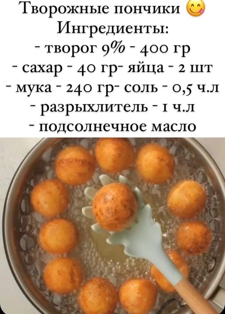 Изображение представляет собой процесс приготовления творожных пончиков. В верхней части кадра расположен список ингредиентов, необходимых для приготовления: творог 9% - 400 грамм, сахар - 40 грамм, яйца - 2 шт., мука - 240 грамм, соль - 0,5 ч.л., разрыхлитель - 1 ч.л. и подсолнечное масло. На заднем плане видна кастрюля или глубокая сковорода, заполненная горячим маслом, в котором обжариваются круглые золотистые пончики. Они равномерно подрумянились и имеют аппетитный вид. Лопатка с силиконовым покрытием удерживает один из пончиков, демонстрируя его на переднем плане. Это отображает как процесс готовки, так и текстуру приготовления данных кондитерских изделий. Фон изображения открыт и создан для концентрации внимания на процессе.