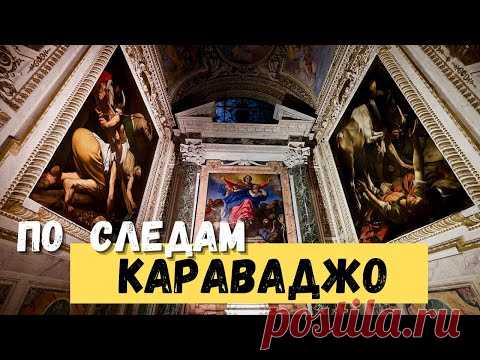 Это изображение демонстрирует внутреннее убранство церкви или музея, украшенного произведениями известного итальянского художника эпохи барокко Караваджо. В центре кадра виднеется купол с богато украшенной лепниной, а вокруг него расположены картины с драматическими сценами в характерной для Караваджо технике кьяроскуро с резким контрастом света и тени. Атмосфера торжественная, привлекательно акцентируется значимость художественного наследия. Желтая полоса с текстом "По следам Караваджо" визуально отделяет композицию, намекая на тематическое погружение в искусство мастера. Действие происходит в Риме, что подчеркивает надпись выше.