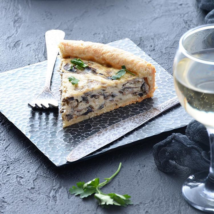 На изображении представлен аппетитный кусок пирога с нежной начинкой из сыра и шампиньонов. Пирог располагается на квадратной металлической тарелке с текстурированной поверхностью, имитирующей волны. Вилочка и нож аккуратно размещены рядом, подчеркивая утончённый стиль подачи. Рядом с пирогом лежит веточка свежей зелени, добавляющая изысканности и ярких цветовых акцентов. Фон выполнен в темных, гранитных оттенках, создавая атмосферу элегантности и спокойствия. В правом краю кадра можно заметить бокал белого вина, частично входящий в кадр, что намекает на готовность к трапезе. Общее оформление композиции настраивает на уютную атмосферу домашнего тепла и гастрономического удовольствия. Текстура топпинга пирога и полупрозрачная корочка демонстрируют высокий уровень кулинарного мастерства.