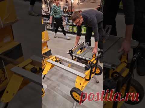 На изображении сцена внутри магазина, где мужчина в черной одежде управляет желтым настольным станком Dewalt. Он наклоняется и что-то настраивает на станке. Вокруг заметны полки с различными инструментами и товарами. На заднем плане женщина в зелено-белой полосатой кофте идет мимо, держа в руках какие-то предметы. Общая атмосфера выглядит функциональной и занятым. Пол в магазине серый, из бетона или плитки, что характерно для таких торговых пространств.