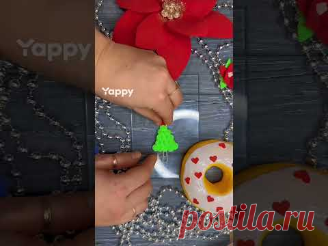 На изображении видно руку человека, который держит небольшой предмет в форме зелёной рождественской ёлочки, помещенной на стол с текстурой дерева. На столе также размещена круглая булочка с белой глазурью, украшенная красными сердечками, создающая контраст своим двухцветным дизайном. В заднем плане расположена декоративная гирлянда из бисера, усиливающая праздничное настроение сцены. Яркие красные лепестки крупного искусственного цветка, вероятно, пуансеттии, придают композиции дополнительную насыщенность и акцентируют внимание на деталях. На самом изображении есть водяные знаки "Yappy" и "postila.ru", свидетельствующие о его источнике и возможной принадлежности к контенту, связанному с веб-платформами.