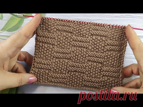 На изображении представлен фрагмент вязания в технике шахматного узора. Две руки держат вязание, выполненное из пряжи светло-коричневого цвета. Узор выглядит как чередование более темных и светлых прямоугольников, образующих шахматную сетку. Фон белый с намеком на зеленые листья, добавляя свежести и легкости изображению. Вязание крепко закреплено на красной вязальной спице. Узор равномерно распределен, демонстрируя высокую степень мастерства и аккуратности в работе. На изображении присутствует водяной знак postila.ru, что говорит о том, что данное изображение может быть связано с обучающими материалами или инструкцией по вязанию.