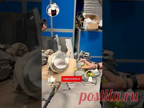 На изображении видна сцена в мастерской или гараже, где происходит процесс подготовки или лакировки автомобильных фар. На переднем плане заметно крупным планом фара, установленная на рабочем столе. Черно-серебристая поверхность фары отражает окружающий свет. Рядом с ней расположены инструменты и принадлежности, которые могут использоваться для лакировки, включая баллончик с лаком, который держит человек справа. У человека на руке часы, он носит черную футболку. Фон сцены представлен синей стеной и полками с различными коробками и предметами, создающими атмосферу загруженности и активности. Также на фоне можно заметить металлические трубы и обшивку, придающие месту индустриальный вид.