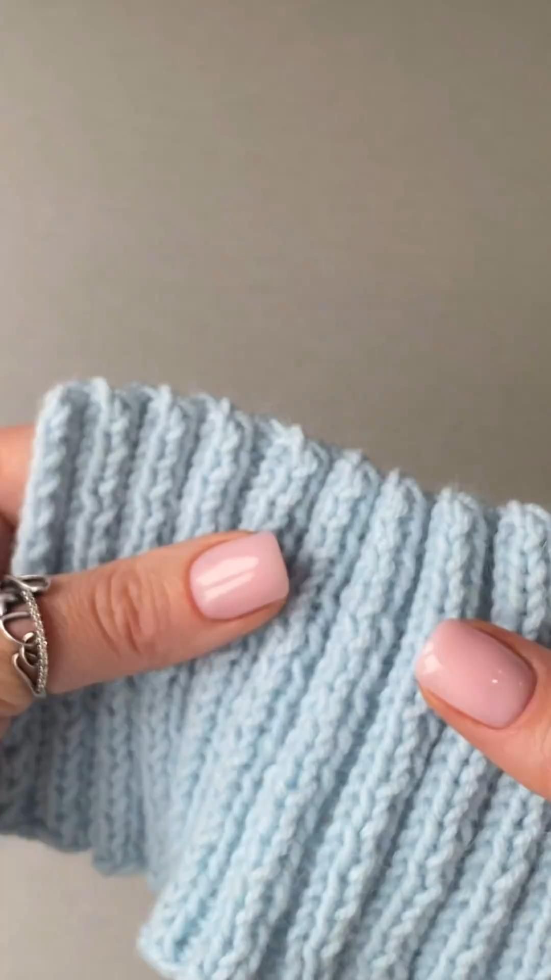 На изображении видны руки человека, держащего вязаное изделие голубого цвета. Изделие связано резинкой, которая отличается рельефной текстурой и вертикальными полосами. Руки, аккуратно ухватившие изделие за края, демонстрируют нежно-розовые ногти с аккуратным маникюром. На левом пальце виднеется кольцо, что придаёт изящество и утонченность общему виду. Фон изображения нейтральный, блеклый, что позволяет сосредоточить внимание на изделии и руках. Видно, что вязание выполнено мастерски, и текстура ткани выглядит плотной и упругой. Эти детали свидетельствуют о технической грамотности вязальщицы и её внимании к деталям. Светопередача мягкая, с акцентом на фактуру материала и руки человека, что подчеркивает нежность и аккуратность всей композиции. Изделие, судя по всему, может служить частью одежды или аксессуаром благодаря своей качественно выполненной структуре.