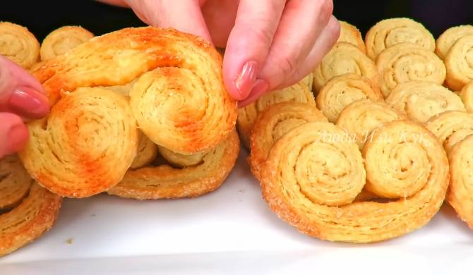 На изображении запечатлен крупный план рук, держащих печенье в форме «ушек», также известных как французские печенья «Пальмэ». Печенья имеют золотисто-коричневый цвет и слоистую текстуру, что свидетельствует о воздушности и хрусткости теста. Каждое печенье состоит из двух симметричных завитков, напоминающих свиток или сердце. Видна структура теста, равномерно пропеченная и слегка карамелизированная, благодаря чему на краях образовалась аппетитная корочка. На заднем плане видна тарелка, на которой выложена стопка аналогичных печений. Светлое освещение подчеркивает текстуру выпечки и блеск на руках, создавая атмосферу домашнего уюта и тепла. Всё это создает впечатление свежей выпечки, готовой к подаче на стол в уютной домашней обстановке.