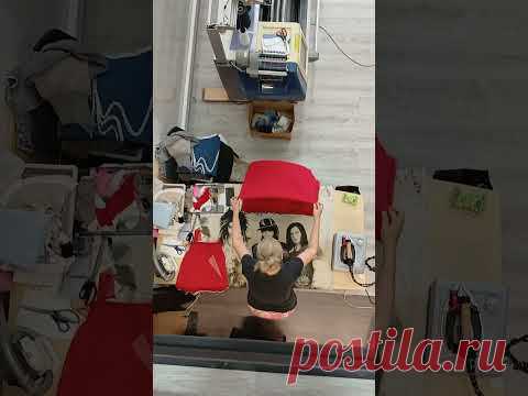 На изображении показан человек, стоящий в помещении, которое напоминает небольшую вязальную мастерскую. Человек держит в поднятых руках ярко-красный вязаный предмет. На заднем плане видны различные ткани и вязальные изделия, которые разложены на столе. Около стены установлено вязальное оборудование, вероятно, промышленная вязальная машина. Стены имеют светлую окраску, которая создает спокойную атмосферу. На столе можно заметить другие яркие компоненты, которые добавляют яркости и разнообразия в сцену. Пол из темного дерева контрастирует с общим светлым фоном, подчеркивая цвета различных материалов. Атмосфера в помещении кажется сосредоточенной на создании и творчестве.